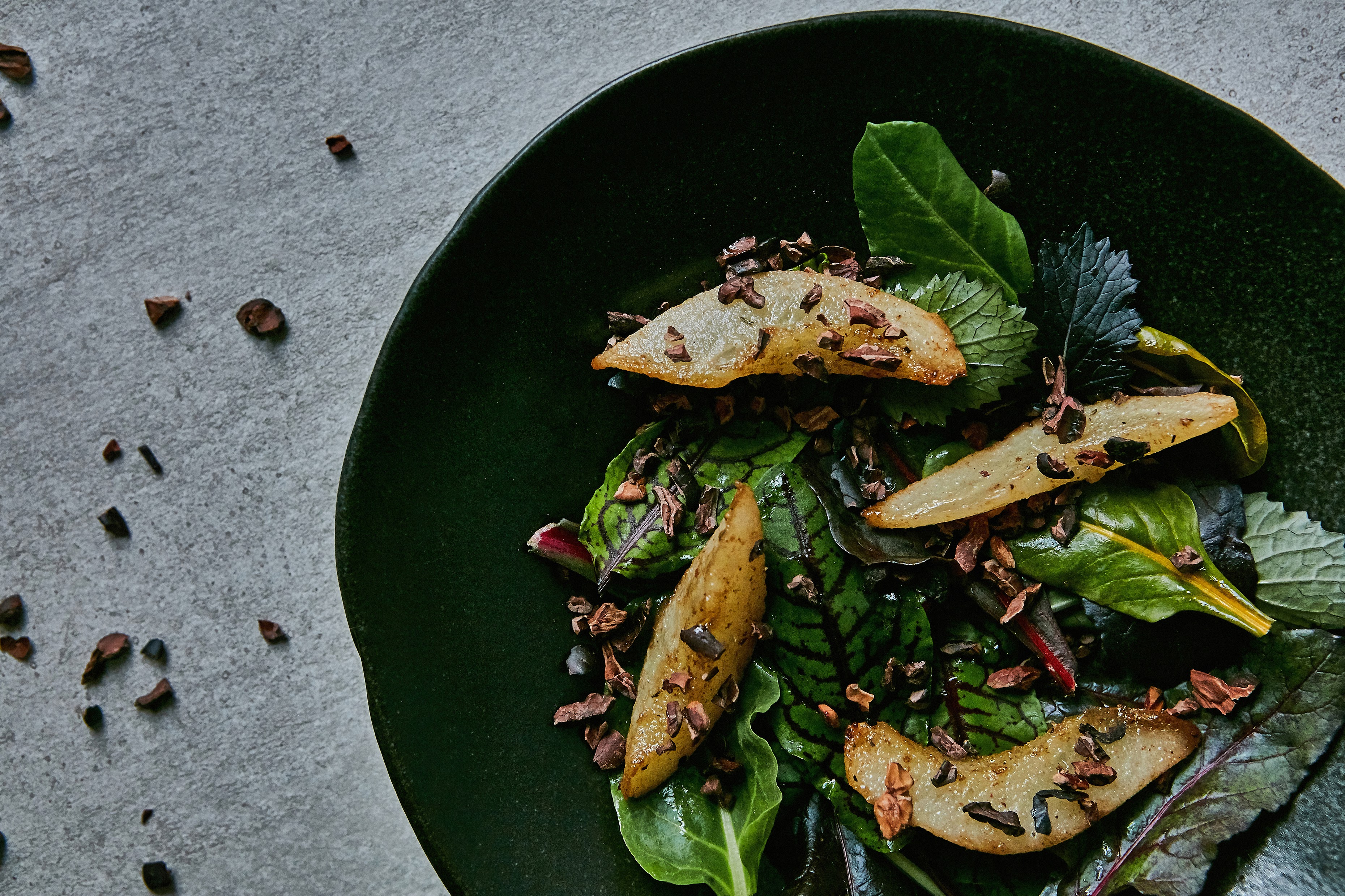 2) Distribuir las hojas verdes sobre un plato y poner encima los gajos de pera acaramelada. Sazonar con sal y pimienta y espolvorear los nibs de cacao.